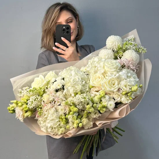 Сборный букет Жемчуг из премиум-раздела, собранный из воздушных гортензий, ароматной сирени, шариков эустомы, сортовых роз, фактурных хризантем и нерине, напоминает изящную россыпь жемчуга.Размер сборного букета Жемчуг - около 70 см