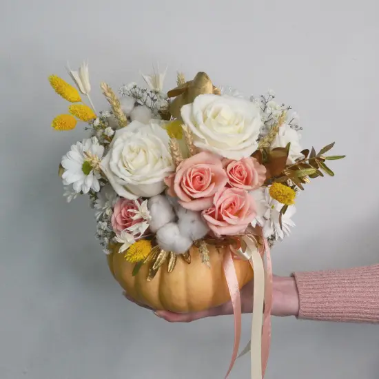 Сборная цветочная композиция в тыковке, выполненная из премиальных роз, сухоцветов, хлопка, эустомы и гипсофилы на флористической губке.Размер композиции в тыковке - около 40 см