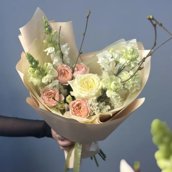 Ароматы весны, собранные в нежном букете. Пышные сортовые розы, весенние веточки, шарики эустомы, полевой антирринум и стойкие гвоздики растопят зимний лёд и подарят весеннее настроение.Размер сборного букете Апрель - около 30 см