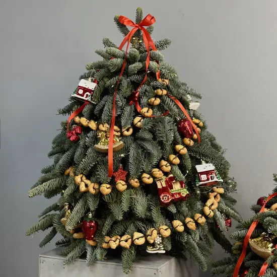 Пышная ёлочка из веточек натуральной датской ели. Яркие игрушки в стиле ретро и гирлянды из бубликов мгновенно окунают в теплые семейные воспоминания!Размер ёлочки - около 55-60 см
