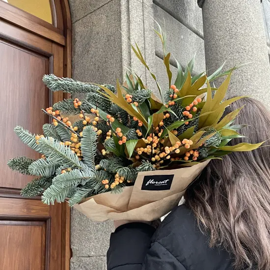 Пышный зимний букет для вашей вазы с пушистыми еловыми веточками, гревиллеей и ягодами илекса.Размер зимнего букета для дома с желтым илексом - около 50-55 см