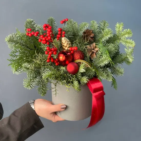Очаровательная хвоя, яркие ягодки илекса и стильный новогодний декор в шляпной коробочкеРазмер композиции Santa Claus S - около 30 см